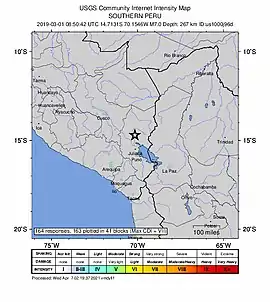 El terremoto de Azángaro de 2019 fue un movimiento telúrico de magnitud 7 que ocurrió el 1 de marzo de 2019 a las 08.50 GMT con epicentro localizado en Azángaro, frente a la provincia de Azángaro, a 67 km de Juliaca, en el departamento de Puno.[1][2][3]
