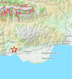 El terremoto de Berja del 23 de diciembre de 1993 es uno de los seísmos de mayor intensidad registrados dentro de los límites de la Provincia de Almería.[5] Sacudió principalmente a las localidades de Berja y Adra donde provocó daños en más de 5000 viviendas y a la ciudad de Almería, España. El seísmo se produjo a las 15:22 hora local,[6] su epicentro se localizó al suroeste de la Sierra de Gádor, cerca del Barranco malo en el término municipal de Berja y sus efectos se sintieron en toda la Provincia de Almería. Tuvo una magnitud de 5,0 (ML) y le sucedió una réplica de magnitud 4,9 (ML) tan solo 12 días después, en concreto, el día 4 de enero de 1994 a las 09:03 hora local.[7] El movimiento sísmico fue sentido también en las provincias de Granada, Murcia, Jaén, Málaga, Córdoba, Ciudad Real, Albacete, Toledo e incluso en algunas zonas de la ciudad de Madrid.[8]