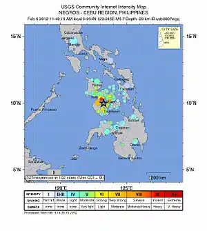 El terremoto de Cebú de 2012 fue un sismo ocurrido a las 11:49:16 hora local (03:49:16 UTC) del 6 de febrero de 2012 que alcanzó los 6,7 grados en la escala de magnitud de momento y el grado IX en la escala de Mercalli.[1] El epicentro se ubicó en el centro de Filipinas, específicamente en la región de Cebú. El terremoto mató a al menos 113 personas, 40 permanecen desaparecidas y 100 resultaron heridas. Además se reportaron daños en 9 edificios y varios deslizamientos de tierra.[2]