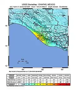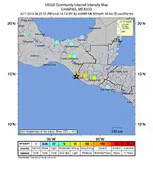El terremoto de Chiapas de 2014 fue un sismo ocurrido a las 06:23:55 hora local (11:23:55 UTC) del lunes 7 de julio de 2014, que alcanzó una magnitud de 7.1 (MW).[1] Según el USGS, el epicentro se localizó a 2 km al sur de Puerto Madero, estado de Chiapas, en el sur de México. El sismo se ubicó a una profundidad de 60 km bajo la corteza terrestre.
