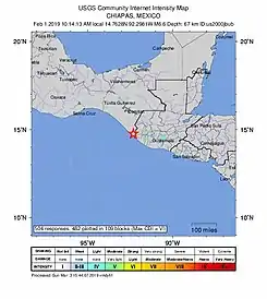 El terremoto de Chiapas de 2019 fue un sismo ocurrido a las 10:14:11 hora local (10:14:11 UTC) del viernes 1 de febrero de 2019, que alcanzó una magnitud de 6.5 (MW). Según el USGS, el epicentro se localizó a 40 km al sur de Ciudad Hidalgo, estado de Chiapas, en el sur de México. El sismo se ubicó a una profundidad de 62 km.[2]