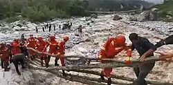 Los bomberos utilizaron botes de goma para llegar a las aldeas afectadas. En las aldeas de Ziyachang y Wandong, 17 personas fueron evacuadas. Los bomberos también observaban el lago represado y advirtieron a los residentes que evacuaran. Los rescatistas evacuaron a más de 900 residentes en Qinggangping, un pueblo cerca de Moxi que estaba amenazado por el rápido flujo de agua.[49] Las autoridades locales estaban preocupadas por la posibilidad de que más deslizamientos de tierra formaran charcos de agua en ríos en otros lugares.[50] Los funcionarios dijeron que se desconoce el alcance de los daños en el río Dadu, pero que estaba siendo monitoreado.[51] El río se descargó más tarde, pero los residentes afectados ya habían evacuado.