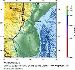 El terremoto de Mozambique de 2006 fue un sismo registrado el 22 de febrero de dicho año en el este de África. El epicentro del fenómeno se localizó a 250 km de la ciudad de Beira y a 520 km de la capital mozambiqueña de Maputo. El terremoto se pudo percibir desde el sur de Zimbabue hasta el norte de Sudáfrica a pesar de que se sintió con mucha más fuerza en Mozambique y tuvo una magnitud de 7.0 grados en la escala sismológica de Richter, siendo el mayor movimiento en décadas en esa zona. Cinco personas murieron y 30 resultaron heridas.[2]