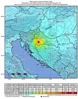 Aproximadamente a las 12:20 p.m. CET (11:20 UTC) del 29 de diciembre de 2020, un terremoto de magnitud 6.4Mw, 6.2ML, golpeó el condado de Sisak-Moslavina, Croacia, con un epicentro a 3 km (1.8 millas) al oeste-suroeste de Petrinja. La intensidad máxima del fieltro se estimó en VIII (muy dañino) a IX (destructivo) en la escala macrosísmica europea. Antes de este evento hubo tres sismos, el más fuerte de los cuales tuvo una magnitud de 5,2 Mw el día anterior. Al terremoto le siguieron numerosas réplicas, la más fuerte de las cuales tuvo una magnitud de 4,8 Mw.[1]