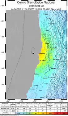 El terremoto de Valparaíso de abril de 2017 fue un fuerte movimiento telúrico que sacudió principalmente a las ciudades de Valparaíso y Santiago el lunes 24 de abril de 2017 a las 18:38 hora local. Su epicentro se localizó frente a las costas de la Región de Valparaíso y tuvo una magnitud de 6.9 Mw.[4][2][3] En la escala de Mercalli, el sismo alcanzó una intensidad VII.[5]