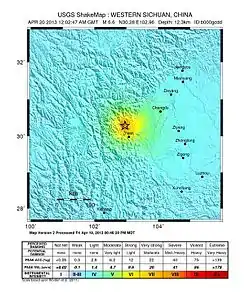 El Terremoto de Ya'an tuvo lugar a las 8:02 hora de Pekín (12:02 UTC) el 20 de abril de 2013. El epicentro se situó cerca de Lushan, Ya'an, en la provincia de Sichuan, China, que está a unos 116 km de Chengdu.[3] La magnitud del terremoto fue de 7.0 grados en la escala de Richter y con una intensidad de hasta IX mercalli.[4]