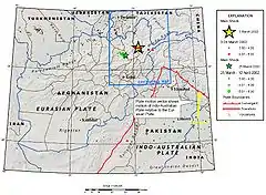 En la región también se observan terremotos de enfoque poco profundo más pequeños, particularmente asociados con zonas de tendencia norte-sur de deslizamiento lateral derecho, como la falla de Chaman , con un grado creciente de acortamiento hacia el norte, que en conjunto acomodan la convergencia altamente oblicua entre los placa índica y placa euroasiática.[4]