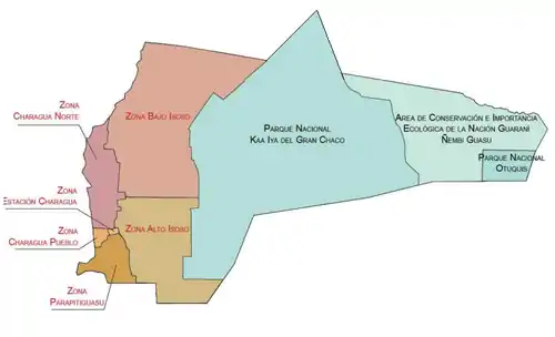 - Zona Parapitiguasu, asume el ámbito territorial de la Capitanía Parapitiguasu y sus comunidades.