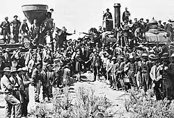 La llegada del ferrocarril, simultáneamente a California y el este en 1869 no fue considerada especialmente beneficiosa por los mormones que gobernaban el territorio. La ceremonia de terminación de las obras del ferrocarril (con la colocación de la llamada Golden Spike, o "Clavo de oro") en Promontory, Utah, para completar el primer ferrocarril transcontinental estadounidense fue boicoteada por los funcionarios del territorio, que pretendían protegerse de la invasión del mundo exterior a la cuenca del Gran Lago Salado.[1]