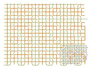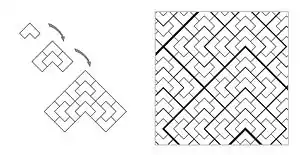 Los mosaicos de Penrose, y poco después los diferentes conjuntos de mosaicos de Amán,[15] fueron el primer ejemplo basado en forzar explícitamente la aparición de una estructura de mosaico de sustitución. Joshua Socolar,[16][17] Roger Penrose,[18] Ludwig Danzer,[19] y Chaim Goodman-Strauss[14] han encontrado varios conjuntos posteriormente. Shahar Mozes dio la primera construcción general, mostrando que todos los productos de los sistemas de sustitución unidimensionales se pueden aplicar mediante reglas de coincidencia.[13] Charles Radin encontró reglas que hacen cumplir el sistema teselados de sustitución del molinillo de Conway.[20] En 1998, Goodman-Strauss mostró que se pueden encontrar reglas de emparejamiento locales para forzar cualquier estructura de mosaico de sustitución, sujeto a algunas condiciones leves.[12]