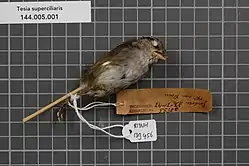 La tesia de Java (Tesia superciliaris)[2] es una especie de ave paseriforme de la familia Cettiidae endémica de la isla de Java, en Indonesia.[3] Es un pájaro de porte pequeño con patas largas y casi sin cola.