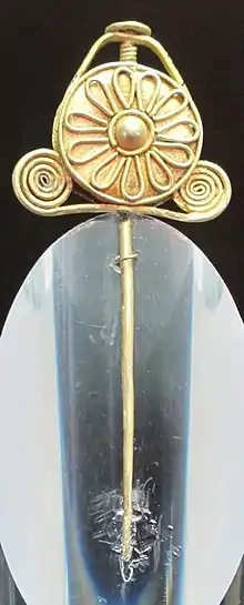 - Un disco grande,[1] provisto de un ónfalos[2] y de un largo mango aplanado terminado en una serie de discos pequeños.