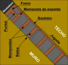 El sostenimiento inmediato del hueco producido por el deshulle de la capa se realiza mediante piezas de madera, fundamentalmente pino y eucalipto. Principalmente la entibación se realiza con mampostas,[lower-alpha 1] piezas cilíndricas que se colocan perpendicularmente a los estratos. La parte superior de la mamposta se apoya sobre una pieza de madera que se denomina bastidor. Este es una pieza de madera de eucalipto, de forma semicilindríca, de 2,5 m de longitud, mayoritariamente. La parte plana del bastidor se apoya sobre el muro (estrato inmediatamente superior de la capa de carbón) mientras que la parte cilíndrica es la que está en contacto con la mamposta. Para ello, la cabeza de la mamposta ha de ser labrada con la forma del bastidor, en una talla que se conoce como boca de lobo. Cada bastidor está contacto con tres mampostas alineadas y paralelas al testero, en un conjunto básico que se denomina jugada. Además cada bastidor se apoya en el bastidor de la jugada inferior, en la disposición que se conocen como "encadenar jugadas". El espacio comprendido entre dos hileras consecutivas de jugadas se denomina calle y tiene una anchura en torno a 1 m.