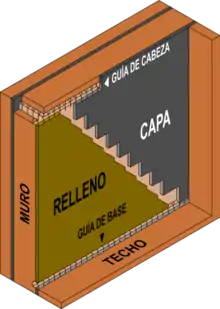 Como entibación auxiliar se utilizan piquetes,[lower-alpha 2] tablas, rachas,[lower-alpha 3] cuñas y forros, todos ellos de madera.