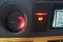 Muchos vehículos poseen un testigo de color rojo para indicar que el freno de estacionamiento está activado o que hay un fallo en el sistema de frenado.[9] En la mayoría de los casos lleva los símbolos ISO del freno de estacionamiento y el de una emergencia del sistema de frenos. En el pasado, las regulaciones de los Estados Unidos exigían que este indicador llevara la leyenda brake
