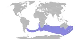 En Sudamérica fue reportado de las aguas de la Argentina,[2] Brasil, Chile, Perú y Uruguay, además de todos los archipiélagos del Atlántico sur: islas Malvinas,[10] islas Georgias del Sur, e islas Sandwich del Sur. Allí sufre, al igual que en otras regiones del mundo, de alta mortandad por enganches accidentales fruto de la acción de la pesca comercial.[11]