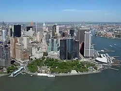 Al noroeste del parque se encuentra Battery Park City, una comunidad planificada construida sobre un vertedero en las décadas de 1970 y 1980, que incluye Robert F. Wagner Park y Battery Park City Promenade. Battery Park City, propuesto en 1966, recibió su nombre del parque.[156]