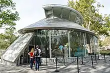 Varios túneles del metro de la ciudad de Nueva York también pasan por debajo de la batería. La antigua estación de South Ferry, inaugurada en 1905 como parte de la primera línea de metro de la ciudad,[42] las líneas Broadway–Seventh Avenue y Lexington Avenue de la antigua Interborough Rapid Transit Company tienen un bucle de globo para permitir que los trenes den la vuelta y cambien entre dos líneas.[162] Cerró en 2009 luego de la apertura de una estación de metro de reemplazo.[163][164] La estación de reemplazo, South Ferry en la línea Broadway–Seventh Avenue (1 tren), inaugurado en 2009, creó una nueva conexión gratuita con la estación Whitehall Street de BMT Broadway Line (N),[163][164] que comprende el complejo de estaciones South Ferry/Whitehall Street.[160] La nueva estación sufrió graves daños tras el huracán Sandy en octubre de 2012[165] y la antigua estación circular se reactivó temporalmente entre abril de 2013[166][165] y junio de 2017, cuando reabrió la nueva estación.[167]