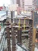 - La construcción implicó la construcción de un sistema de apuntalamiento de los muros de los pozos de cimentación (julio de 2007)