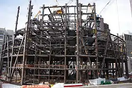 La erección de la superestructura de acero por encima del nivel del suelo comenzó en octubre de 2008 con la instalación de la primera de las dos grúas de torre pesadas Favelle Favco.