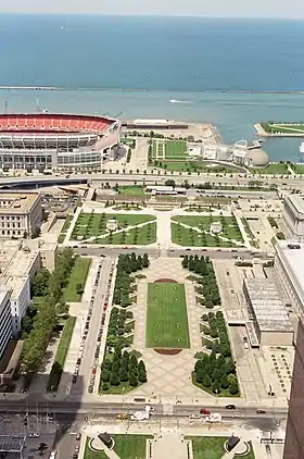 The Mall fue concebido como parte del Plan de Grupo de 1903 por Daniel Burnham, John Carrère y Arnold Brunner[2] como un vasto espacio público flanqueado por los principales edificios cívicos y gubernamentales de la ciudad, todos construidos en estilo neoclásico. Muchos de esos edificios se construyeron durante las siguientes tres décadas, incluido el Palacio de Justicia de Metzenbaum (1910), el Palacio de Justicia del Condado de Cuyahoga (1912), el Ayuntamiento de Cleveland (1916), el Auditorio Público (1922), el edificio principal de la Biblioteca Pública de Cleveland (1925), y el edificio de la Junta de Educación de las Escuelas Públicas de Cleveland (1931).[3] Otros edificios incluyen Key Tower, el Centro Global para la Innovación en Salud, el Hilton Cleveland Downtown Hotel y el Banco de la Reserva Federal de Cleveland.