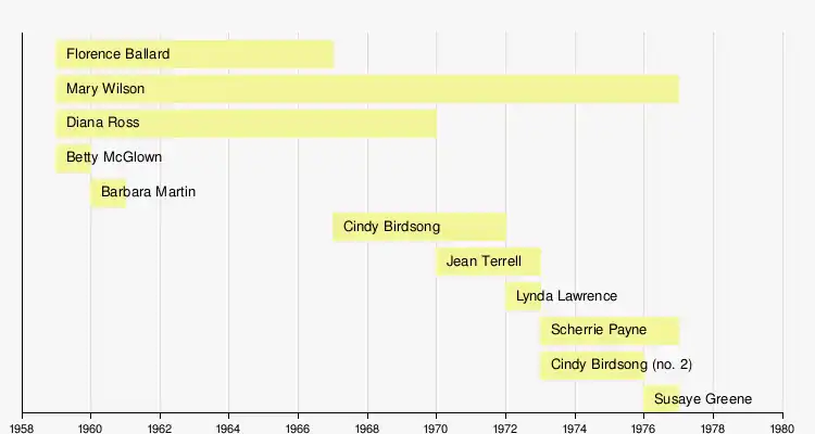 Sus primeras integrantes fueron Florence Ballard, fundadora del grupo;[3] su amiga Mary Wilson y una compañera del coro de la iglesia de esta última, Diana Ross. Es la agrupación vocal femenina de mayor éxito en la historia de la música popular de Estados Unidos y uno de los mejores de la historia.[4] Durante la llamada beatlemanía, fue el único grupo estadounidense que obtuvo numerosos éxitos sucesivos, al igual que el cuarteto británico.[5][6]