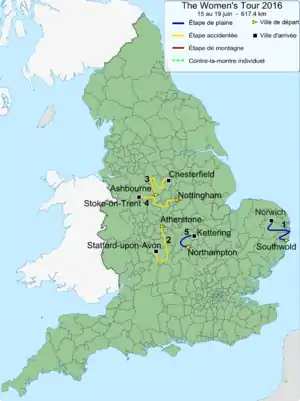 2.ª etapa | 16 de jun | Atherstone – Stratford-upon-Avon | ![]() etapa escarpada | 140 | ![]() | ![]() |