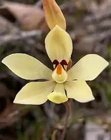 Es una orquídea con un tallo cilíndrico con una sola hoja que florece en el invierno y primavera en la naturaleza en una inflorescencia erecta de 25 cm de largo, con 1 a 4 flores perfumadas con olor a limón.[1]