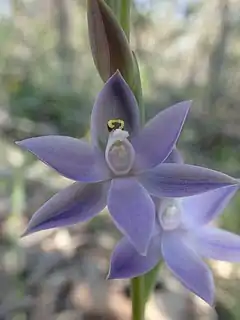 Thelymitra: nombre genérico que deriva de las palabras griegas thely = (mujer) y mitra = (sombrero), refiriéndose a la forma de la estructura del estaminodio o estambre estéril en la parte superior de la columna que es llamado mitra.
