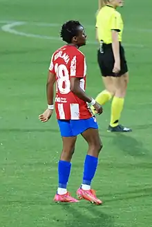 El 6 de julio de 2021 se hizo oficial su fichaje por el Atlético de Madrid.[30] Debutó con el equipo rojiblanco el 4 de septiembre de 2021, siendo suplente en la victoria por 5-0 sobre el Rayo Vallecano en la primera jornada de liga.[31] El 31 de octubre marcó su primer gol como rojiblanca ante el Villarreal tras asistir en el primer gol del partido.[32] Fue utilizada como jugadora revulsiva casi toda la campaña, intentando agitar los partidos desde el banquillo, salvo las últimas tres jornadas de liga, en las que el entrenador confió en ella como titular. Marcó 6 tantos y acabaron la liga en cuarta posición a un punto de la tercera plaza que daba el último cupo para disputar la Liga de Campeones. Fueron finalistas en la Supercopa, en la que perdieron ante el F. C. Barcelona. En la Copa de la Reina el equipo cayó en octavos de final ante el Sporting de Huelva.