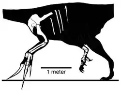 En 2010, Senter y James utilizaron ecuaciones de longitud de las patas traseras para predecir la longitud total de las patas traseras en Therizinosaurus y Deinocheirus. Llegaron a la conclusión de que un Therizinosaurus promedio puede haber tenido patas de aproximadamente 3 metros de largo.[9] Más recientemente, Mike Taylor y Matt Wedel sugirieron que todo el cuello tendría 2,9 veces el tamaño del húmero, que era de 76 centímetro, lo que daría como resultado un cuello de 2,2 metros de largo según las comparaciones con la serie de vértebras cervicales de Nanshiungosaurus.[10] La característica más distintiva de Therizinosaurus era la presencia de gigantescos unguales en cada uno de los tres dedos de sus manos. Estos eran comunes entre los terizinosáuridos, pero particularmente grandes y rígidos en Therizinosaurus , y se consideran los más largos conocidos de cualquier animal terrestre.[4] Cada brazo medía en total 2,5 metros de largo, y su única garra en forma de guadaña medía 70 centímetros en su curva externa. Esa longitud no incluye la cubierta córnea que debe haber rodeado la garra, con la que pudo llegar a medir 1 metro de largo.[11][12][13] eso hace que la sola garra mida lo que una guadaña para cortar césped alto, sólo que la garra del Therizinosaurus es más pesada. Se encontró también, con una pelvis de 2,5 metros de ancho. Los primeros ejemplares consistían en algunas grandes garras halladas por la expedición conjunta soviético-mongola de 1948, así como en otras partes de Mongolia las posteriores 1957, 1959 y 1960 fueron en el desierto de Gobi. Fósiles asociados incluyen patas incompletas y un diente.