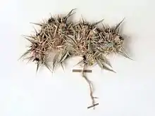 Los capítulos agrupan flores flosculosas homógamas hermafroditas. El involucro es de forma ovalada con brácteas multiseriadas imbricadas: las exteriores foliáceas parecidas a las hojas, o sea lanceoladas con unas cuantas (3-4) finas espinas laterales y una apical; las interiores sin espinas marginales pero con una larga espina apical; las más interiores son mucho más largas y de morfología similar. El receptáculo es plano con páleas laceradas, y los flósculos tienen lóbulos largos y agudos. Los frutos son cipselas densamente sericeas con un vilano uniseriado de pelos plumosos.[3]
