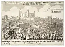 Strafford se encontró con su destino dos días después en Tower Hill, tras recibilr la bendición del Arzobispo Laud, por aquel entonces también encarcelado en la Torre. Fue ejecutado ante un gentío de 200.000 personas el 12 de mayo de 1641. Su pariente, otro Thomas Wentworh, en este caso conde de Cleveland, asistió a la ejecución y luchó en el bando realista durante la Guerra civil inglesa. Tras la ejecución de Strafford, Irlanda se levantó en rebelión en octubre de 1641. Esto llevó a un incremento en la tensión entre el rey y el parlamento, llegando a reclutarse ejércitos.