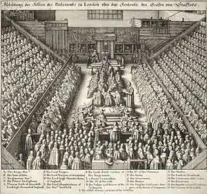 Thomas Wentworth, I conde de Strafford (13 de abril de 1593 - 12 de mayo de 1641) fue un estadista inglés y una destacada figura de la época previa a la Guerra Civil Inglesa. Formó parte del Parlamento y apoyó al rey Carlos I de Inglaterra. Entre 1632 y 1639 ocupó el cargo de Lord Diputado de Irlanda, cargo que desempeñó con dureza. Llamado nuevamente a Inglaterra, se convirtió en el principal consejero del rey, tratando de fortalecer la posición real frente al parlamento. Cuando fue condenado a muerte, Carlos firmó la sentencia.