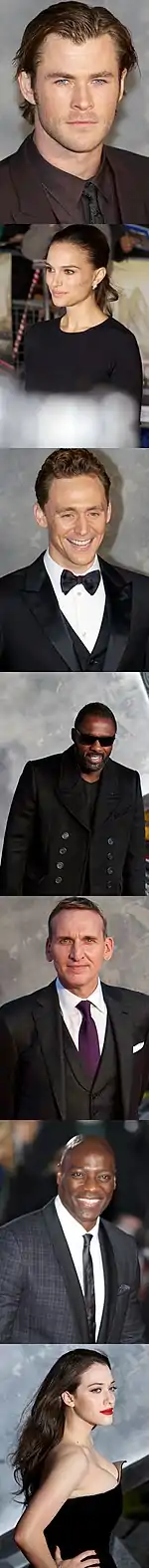 Además, Alice Krige interpreta a Eir, una médica asgardiana.[50] Chris O'Dowd aparece como Richard,[51][52] un pretendiente de Jane Foster. Benicio del Toro, que interpreta al Coleccionista en Guardianes de la Galaxia, aparece en una escena entre créditos con Ophelia Lovibond, que interpreta a su ayudante Carina.[53][54][55][56] Jonathan Howard interpreta a Ian Boothby,[57] el pasante de Darcy. Tony Curran aparece como Bor, padre de Odín, basado en la deidad del mismo nombre.[58][59] Clive Russell interpreta a Tyr, basado en la deidad del Tyr.[60] Richard Brake interpreta a un capitán de los Einherjer.[60] Chris Evans tiene un cameo no acreditado como Loki haciéndose pasar como el Capitán América,[61] mientras que Stan Lee, cocreador de Thor, tiene un cameo como un paciente en una sala mental.[62]