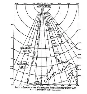 ![]() Supuesta ubicación de la Tierra de Crocker (avistada por Robert Peary) y de la Tierra de Bradley (avistada por Frederick Cook). | ||