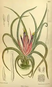 Son plantas con hábitos de epífitas que alcanzan un tamaño de hasta 9 cm, caulescentes, ramificadas. Hojas de 9-18 cm; vainas de 1-1.5 cm de ancho, suborbiculares, densamente patente cinéreo a pardo claro lepidotas; láminas 0.5 cm de ancho, densamente patente cinéreo lepidotas, involutas cuando secas. Escapo de 6-8 cm, decurvado; brácteas imbricadas, las superiores con láminas distintas filiformes. Inflorescencia 5-6 cm, simple, péndula, con 3-5 flores. Brácteas florales 3.5-4 cm, imbricadas, ecarinadas, nervadas, esparcidamente adpreso punteado lepidotas, membranáceas. Flores sésiles; sépalos 3 cm, nervados, membranáceos, esparcidamente lepidotos, libres, los 2 posteriores carinados al menos basalmente; pétalos violeta. Los frutos son cápsulas de 3 cm.[2]