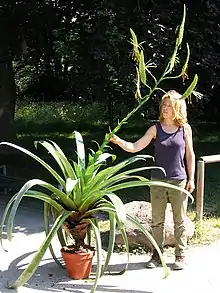 Son plantas rupícolas o terrestres, que alcanzan un tamaño de hasta 350 cm en flor, acaules. Las hojas de 125-160 cm, en una roseta patente a suberecta; vainas c. 20 cm de ancho, pardo oscuro, densamente adpreso a subpatente lepidotas en el haz, moderadamente adpreso punteado lepidotas en el envés; láminas 12-15 cm de ancho, prominentemente nervadas cuando secas, glabras, ampliamente triangulares. Escapo más largo que las hojas; brácteas hasta 44 cm, mucho más largas que los entrenudos, subfoliáceas, ocultando al escapo. Inflorescencia compuesta; raquis 100-200 cm; brácteas primarias en su mayoría sin lámina, las vainas 3-4 cm, mucho más cortas que las espigas; espigas (26-)55-75 cm, complanadas, con 12-20 flores, la base estéril patente a subascendente, la porción fértil erecta. Brácteas florales 3-4 cm, ligeramente más cortas que los sépalos pero cubriéndolos en la antesis, subpatentes a divergentes, ecarinadas, nervadas, glabras, coriáceas. Flores divergentes a ascendentes; pedicelos hasta 6 mm; sépalos 3.5-3.8 cm, prominentemente nervados, ecarinados, coriáceos, libres; pétalos amarillo pálido a blancos. [1]
