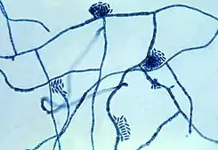 ![]() Micrografia del hongo Hortaea werneckii, el agente causante de la tinea nigra | ||