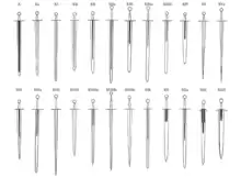 - Z. forma cuadrada, con sus subtipos utilizados para definir de cerca el área y la edad, Z1 y Z2b (más común en el sureste de Europa), Z3 ("cabeza de gato", típico de las espadas venecianas), Z4 (típico de Serbia y Bosnia).