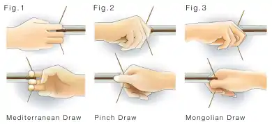 Esta es cumplido por el dedo índice en la cuerda encima de la flecha, y el dedo medio y anular en la cuerda, debajo de la flecha. Normalmente, la flecha es puesta a la izquierda del arco. El tiro moderno mantiene el esfuerzo en la mano al mínimo. El único trabajo de la mano es al hacer el esfuerzo requerido para mantener el hilo del arco en los dedos. La muñeca está fuera del disparo flexionado desde el arco. Estas flechas mantienen menos presión en la mano, y así, obtienes más relajación en el lanzamiento de la mano. Esto, generalmente, resulta con más puntería y consistencia en el tiro.