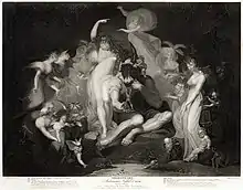 A Midsummer Nights Dream acto IV, Escena I. Titania, con hadas atendiéndola. Pintura de Henry Fuseli, publicada en 1796.