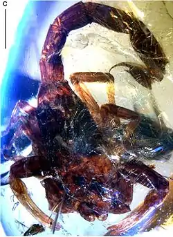 - Riquelme, F.; Villegas-Guzmán, G.; González-Santillán, E.; Córdova-Tabares, V.; Francke, O. F.; Piedra-Jiménez, D.; Estrada-Ruiz, E.; Luna-Castro, B. (2015). «New Fossil Scorpion from the Chiapas Amber Lagerstätte». PLOS ONE 10 (8): 1-20. PMC 4526686. PMID 26244974. doi:10.1371/journal.pone.0133396.