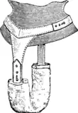 Desde mediados del siglo XIX y durante la mayor parte del siglo XX se utilizaron complementariamente tiradores que recorrían el cuerpo desde los hombros hasta los genitales y sostenían las toallas, de tela o desechables, en contacto con la vulva. Un anuncio de 1870 los publicitaba como «tiradores de vendajes».[39] Patentes de 1891 y 1894 incorporaban una bolsa o saco catamenial en lugar de una toalla para recolectar orina y flujo.[40][41] Otros productos similares fueron los cinturones menstruales que se ajustaban a la cintura,[42] y los pantalones sanitarios, con una abertura en la entrepierna y un sistema de anillas que mantenían las toallas en su posición.[43] También podían sostener otros materiales absorbentes como algodón, esponjas, viruta de madera, guata, lana y papel.[11] A fines de siglo, modelos de toallas y cinturones se listaban en catálogos de venta al por mayor y las consumidoras podían adquirirlos en farmacias y grandes almacenes como Sears o Montgomery Ward. También podían comprarlos directamente al fabricante mediante volantes y publicidad en revistas orientadas a mujeres como Harpers Bazaar, Woman's World and Jenness Miller Monthly y The Delineator. Algunas publicaciones proveían el servicio de promotoras, que vendían estos productos con sistema puerta a puerta.[44]