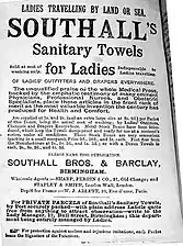 La primera patente bajo el nombre «toalla sanitaria» surgió en 1885, por Robinson and Sons de Chesterfield, Inglaterra, fabricantes a su vez del tejido gamgee, derivado de la lana y utilizado como apósito quirúrgico.[32] El primer modelo comercializado de toalla desechable corresponde a la compañía química Southalls Ltd en Birmingham, lanzado a fines de la década de 1880.[32][33][34] Uno de sus anuncios de 1888 se colocó en una tienda de antigüedades en un intento de evitar herir susceptibilidades del público. Se refería al producto como toallas para «señoritas que viajan por tierra y mar» («Ladies Travelling by Land and Sea») y «artículos patentados de ropa interior. Indispensables para las señoritas que viajan». Mencionó también el hecho de que estas debían lavarse y podían incinerarse una vez utilizadas.[35]