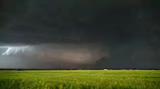 ![]() Vista del tornado desde el sureste a las 18:28 horas; se aprecia su cercanía y fuerza. | ||