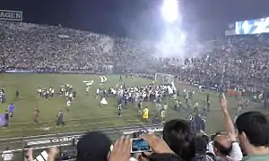 ![]() Jugadores del Club Olimpia celebran, junto a aficionados, la obtención de su cuadragésima liga local. | |||||