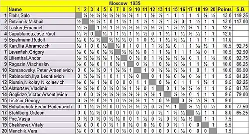 En el ejemplo de la imagen correspondiente a la clasificación final del torneo de Moscú de 1935, el ganador (Flohr) venció al clasificado en décimo lugar (Romanovsky), hizo tablas con el número 2 (Botvinnik) y no perdió ninguna partida. De las 19 partidas que jugó, Flohr ganó siete e hizo tablas en doce, por lo que sumó 13 puntos.