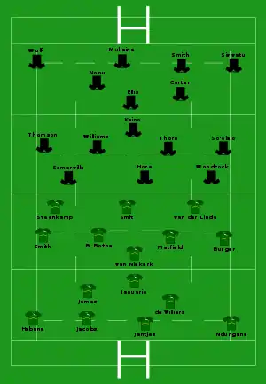 Tries: Bekker 8' c Nokwe (4) 12' m, 25' m, 35' c, 49' m Jacobs 44' c Pienaar 68' c Ndungane 78' c Con: James (3) Montgomery (2) Pen: James 20' |