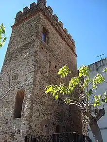 Esta es de tipo señorial almenada. Además también se aprecian distintos tipos de vestigios de amurallamientos que circundaban parte de la población. La fábrica principal del cuerpo de la torre es de sillarejo con sillares en sus esquinas. Se compone de planta baja y tres alturas.